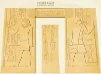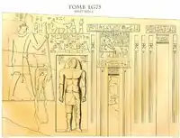 The Mastaba of Khafraankh G 7948 (LG 75) is located in a zone Eastern necropolis of Giza on extrema east ridge of necropolis behind a row of G 7000 mastabas, dated to the end of the 5th dynasty.[2] Initial descriptions of the uncovered mastabas were published by Auguste Mariette[3] and more detailed by Henri Naville.[4] A copy of the inscriptions in the mastaba was made by Emmanuel Rouge during his first visit of this mastaba LG75.[5] The architecture and inclusion in the classification of building types, including their mutual comparison in the western and eastern necropolis, were elaborated by Reisner.[1] The decoration of mastaba G 7948 was comprehensively described by Junker.[6] Archaeological, iconographic findings of the expeditions in 1996-2002 were published in the work of E. Kormysheva et all.[7]