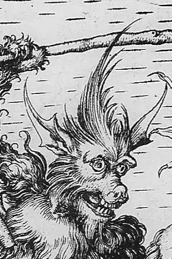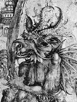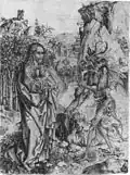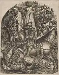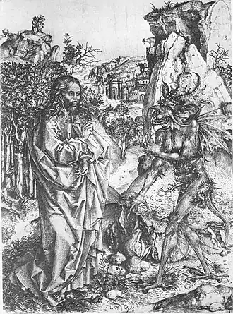 The Temptation of Christ is his most famous and common print, existing in about 20 impressions.[4][5] It draws inspiration from the compositions of Michael Pacher and Master E. S., but marks a step forward from these models by integrating the monumental confrontation between good and evil into a fully realized landscape setting apparently observed from nature.[4][14] In particular, the design of Satan recalls the demons from Schongauer's The Torment of St. Anthony while providing a notable precedent for Albrecht Dürer's depiction of the devil in Knight, Death, and the Devil.[4]