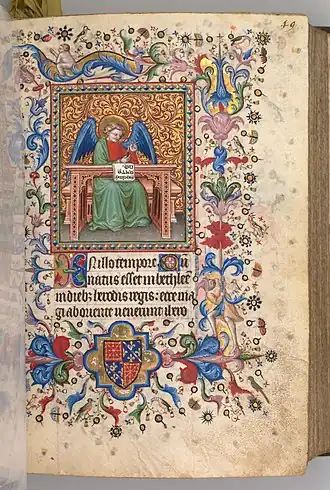 There is also broad agreement that the artist brought recent Italian influences to French art. He was influenced by the illuminations of Niccolò da Bologna and hence may have worked in Bologna; and after having spent several years in France he may have returned to Italy later in life.[5] When decorating the initials for which the artist is named, he worked for John, Duke of Berry.[11] The art historian Robert G. Calkins has argued that as time passed, the Master of the Brussels Initials gained increased control over the manufacturing of the manuscripts to which he contributed with illuminations, moving from "simple intrusions" in manuscripts "otherwise totally decorated by indigenous artists"[12] early in his career in France to having free rein when later in his career receiving commissions to finish an abandoned manuscript, in the case of the Brussels Hours.[13]