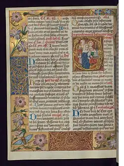 The manuscript contains a total of 236 leaves that are made of parchment. The contents of the manuscript appears to have undergone rebinding during the 19th century and are now covered in a dark blue Morocco leather with gilded decorations. This illuminated medieval manuscript is currently in the Walters Art Museum in Baltimore, Maryland. The contents of the manuscript include illuminated miniatures and Flemish-style borders that feature flowers, insects, and jewels. Most of the written pages have two columns with 33 lines in red ink and Gothic Bastarda calligraphy.[1]