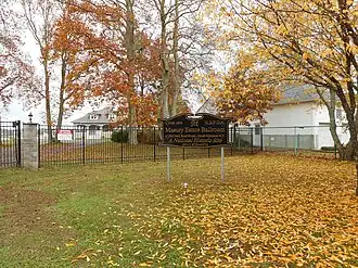 Sign for the historic Masury Estate Ballroom, which is behind the wrought-iron fence behind that sign.