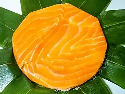 Masuzushi is made of vinegared trout sashimi on top of vinegared rice and wrapped in bamboo leaves. Once the fish and rice is wrapped in bamboo leaves, a weight (often a heavy stone) is kept on top for several hours in order to compress and complete the dish.[2][3] It is traditionally kept in a round bentwood box known as a mage-wappa, which is then sealed by two bamboo sticks.[4] There are also masuzushi which consist of two layers of fish and rice.[2]