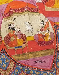 ![]() Guru Hargobind, with Mata Nanaki, and four children. From an illustrated and illuminated folio of a Dasam Granth manuscript by Miha Singh of Kashmir, ca.1839–1843 | |