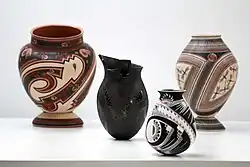 Emphasis is generally on quality rather than quantity, differing from pottery production in central Mexico.[1] Most pottery that is produced is of lesser quality with thicker walls and less-artistic painting. There is a middle group that makes good quality and an elite number who can make truly artistic wares. These top artists include members of Quezada's family (Lydia, Nicolas, Noe, and Damian Quezada), the Ortiz family (Felix, Nicolas, and Macario), Taurina Baca, and Hector and Graciella Gallegos, among others. Nicolas Ortiz is best known for creating sculptural pieces.[4] From the last category come some of the best handmade pottery in the world.[7]