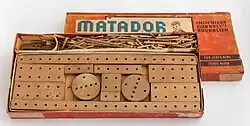 Matador is a wooden toy set. The bricks are held together using special wooden sticks.
