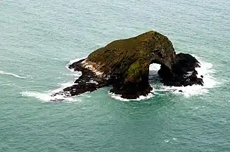 A sea arch is eroded into steeply dipping conglomerate and sandstone of Matapia Formation,[2] which is a poor to moderately bedded conglomerate with a pebbly and bouldery sandstone, about 18 million years old,[3] which originated with the Houhora Volcanic Group and other volcanic rocks. A solid rocky platform surrounds the island.[4]