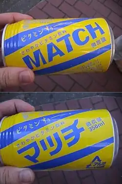 Match (マッチ, Macchi) is a carbonated Japanese soft drink. Match is sold in 270ml (In a plastic bottle), 350ml (Can), 480ml (Can), and 500ml (in a plastic bottle), and 1.5L (in a plastic bottle).[1]