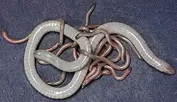 Caecilians can reproduce either by oviparity or viviparity, with some young having an aquatic larval stage while some develop to live on land immediately.[8] Oviparous females build nests on land and keep their clutch there until they hatch, regardless of if they have an aquatic stage or not.[8] Once young with an aquatic stage hatch they are able to survive on their own in the water without any more maternal care, however other young are altricial when they hatch, and rely on their mother to look after them until they develop enough to live fully on land.[8] The mother feeds these altricial young by a process known as maternal dermatophagy, in which she will feed pieces of her skin to her young.[12] Viviparous caecilians also give birth to altricial young.[8] These young may be fed by maternal dermatophagy in the same way that oviparous species are fed, or they may be fed by a more specialized version in which the young eat their mother's hypertrophied oviduct or drink from her cloacal opening.[12]