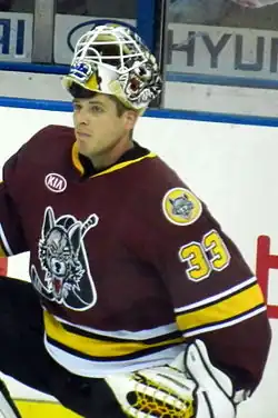 In the off-season he was re-signed to another one-year two-way contract.[32] He played the majority of the season with the newly established Texas Stars, but was called up and played in one game for Dallas.[10] Entering the playoffs Climie was the backup goaltender, but a concussion to Brent Krahn elevated him to the starting role.[33] With Climie in net the Stars advanced to the Calder Cup Finals.[2] Playing against the heavily favored Hershey Bears, Texas took a 2–0 series lead on the road.[34] In game 3 the Stars took a 3–1 lead before giving up 5 straight goals to Hersey losing 6–3.[35] The Bears won the next two games giving them the 3–2 series lead and a chance to win the Calder Cup in game 6. With Texas facing elimination Climie was benched in favor of Krahn who returned from his injury. Texas lost the game 4–0 as Hershey won its eleventh Championship.[36]