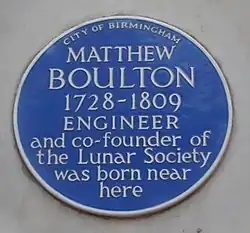 Boulton is recognised by several memorials and other commemorations in and around Birmingham. Soho House, his home from 1766 until his death, is now a museum,[120] as is his first workshop, Sarehole Mill.[121] Matthew Boulton's family papers, along with the records of James Watt and family and the firm of Boulton and Watt collectively form the Archives of Soho and are held at Birmingham Archives and Collections,[43] at the Library of Birmingham. He is recognised by blue plaques at his Steelhouse Lane birthplace and at Soho House.[122] A gilded bronze statue of Boulton, Watt and Murdoch (1956) by William Bloye stands opposite Centenary Square in central Birmingham.[123] Matthew Boulton College was named in his honour in 1957.[124] The two-hundredth anniversary of his death, in 2009, resulted in a number of tributes. Birmingham City Council promoted "a year-long festival celebrating the life, work and legacy of Matthew Boulton".[125]