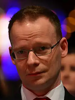 Matthias Höhn was born in Stolberg in the Harz Mountains, but grew up in Sangerhausen from 1977 onwards, where he also spent his entire school career. In 1982 he was enrolled at the Polytechnic High School (POS) "Bernhard Koenen". From 1984 to 1991 he then attended the POS "Juri Gagarin" and from 1991 to 1994 the state grammar school "Geschwister Scholl", which he left with High school graduation. He completed his military service in 1994/95. From 1995 to 2003 he studied journalism and communication sciences and Slavic philology at the Free University of Berlin. He was a member of the state parliament of Saxony-Anhalt from 2002 to 2017. He became member of the bundestag after the 2017 German federal election.[2] He is a member of the defense committee.[3] For his group he is spokesman for security policy.[4] Höhn is married with his husband.[5]