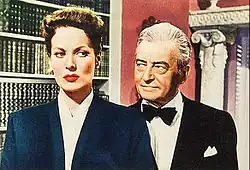 Later that year, O'Hara starred opposite Power, George Sanders, Laird Cregar and Anthony Quinn in Henry King's swashbuckler The Black Swan. O'Hara recalled that it was "everything you could want in a lavish pirate picture: a magnificent ship with thundering cannons; a dashing hero battling menacing villains ... sword fights; fabulous costumes ...". She found it exhilarating working with Power, who was renowned for his "wicked sense of humor".[68] O'Hara grew very concerned about one scene in the picture in which she is thrown overboard in her underwear by Power, and sent a warning letter home to Ireland in advance.[69] She refused to take her wedding ring off in one scene which resulted in screen adjustments to make it look like a dinner ring.[70] Though the film was praised by critics and is seen as one of the period's most enjoyable adventure films, the critic from The New York Times thought O'Hara's character lacked depth, commenting that "Maureen O'Hara is brunette and beautiful—which is all the part requires".[71]