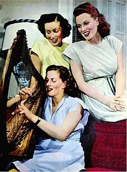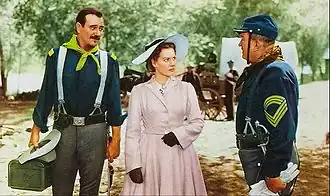O'Hara instead starred in the Technicolor war picture, To the Shores of Tripoli, her first Technicolor picture and first on-screen partnership with John Payne, in which she portrayed Navy nurse Lieutenant Mary Carter.[64] Though the film was a considerable commercial success, becoming a benchmark for "service pictures" of the era, O'Hara later commented that she "couldn't understand why the quality of his (Bruce Humberstone's) pictures never seemed to match their impressive box-office receipts".[64] Malone wrote that "nobody in the film seemed to have lived life. The character's emotions, like their uniforms, seem too streamlined".[65] O'Hara next played an unconventional role as a timid socialite who joins the army as a cook in Henry Hathaway's Ten Gentlemen from West Point (1942), which tells the fictional story of the first class of the United States Military Academy in the early 19th century. The film was disagreeable to O'Hara because Payne dropped out and was replaced by George Montgomery, whom she found "positively loathsome".[66] Montgomery attempted to make a pass at her during the production, prolonging his kiss with her after the director had yelled "cut".[67]