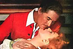 In 1952, O'Hara played Claire, the daughter of the musketeer, Athos, in At Sword's Point, which according to her showed the "new Maureen O'Hara".[129] The film had actually been made in 1949 but was not released until 1952.[12] The role was the most physically demanding of her career, doing her own stunts and training in the art of fencing for six weeks under Belgian-born fencing master Fred Cavens.[130] She disliked director Lewis Allen and producer Howard Hughes, whom she thought was "cold as ice".[131] The critic from The New York Times appreciated O'Hara's swordsmanship in the film, stating that she was "snarling like a Fury, impales her opponents as though she were threading a needle."[132] O'Hara next played Irish immigrant Australian-based cowgirl, Dell McGuire, in Lewis Milestone's drama Kangaroo (1952), set during the drought of 1900. Kangaroo is noted for being the first Technicolor film to be shot on location in Australia,[133] mostly shot in the desert near Port Augusta. Although O'Hara disliked the production due to changes made to the script,[134] she found the Australians extremely welcoming.[135] The Australian government offered her a plot of land during the production to own permanently, but she turned it down for political reasons, only to later discover that significant oil reserves were on the land.[136]