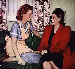 In 1945, O'Hara starred opposite Paul Henreid in The Spanish Main as feisty noblewoman Contessa Francesca, the daughter of a Mexican viceroy.[85] O'Hara described it as "one of my more decorative roles",[86] as her character is a particularly aggressive one among the men on a ship, and during the course of the film her face is smothered in chimney soot.[87] O'Hara almost did not win the role when another actress falsely told RKO executive Joe Nolan that she was "as big as a horse" after giving birth to a daughter in 1944.[88] Around this time "an actress named Kathryn" also falsely accused O'Hara of making sexual advances towards her in an elevator, which she believed was a way for the actress to gain attention at the start of her career.[89] During the production of The Spanish Main, O'Hara was visited by John Ford, who was initially turned away for being shabbily dressed, but was later admitted. He informed her about the project that would become The Quiet Man (1952). Malone notes that in the film O'Hara "shows her determination not to leave her sexuality at the birthing stool", commenting that she looks "deliciously fragrant in the splashy histrionics on view here, in RKO's first film in the three-color Technicolor process"[88] O'Hara became a naturalized citizen of the United States on 24 January 1946,[7] and held dual citizenship with the United States and her native Ireland.[90]