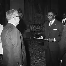 Maurice Gouandjia presented his credential letters as Ambassador of Central African Republic to Italy to Giovanni Leone on 18 May 1973.