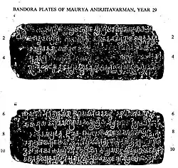 During 6th-7th century, the Mauryas seem to have extended their rule to southern Konkan (the present-day northern Goa), where the Bhojas may have been their feudatories.[8] Inscriptions of kings Anirjita-varman and Chandra-varman, who ruled from the Kumara-dwipa island (modern Cumbarjua), have been discovered in this area.[8] Historians have dated these inscriptions to 5th-6th century on palaeographical grounds.[6] The dynasty of these kings is not certain, with some historians identifying them as Mauryas,[6] while others identifying them as Bhojas.[12] For example, Chandravarman's inscription is fragmentary and only few letters are visible in the first line. D.C. Sircar, who read these letters as "māryya", comments that they could have formed another word or a part of another word, including "...m āryya", "mauryya", or "praṇayinā".[5]