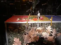 In the period 1980–1984, the Heroes' Mausoleum was expanded by building a parade terrace, imposing access stairs, museum rooms, a 16 m long and 3.5 m high bas-relief made by the sculptor Adrian Radu from Câmpulung. A cup made of Albești stone was also built, in which an eternal flame burns in memory of the fallen heroes in Mateiaș.[2]