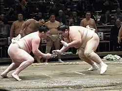 If a wrestler's mawashi comes off during a tournament bout, he is automatically disqualified.[3] This is extremely rare, but did occur in May 2000, when sandanme wrestler Asanokiri's mawashi came off during a match with Chiyohakuhō.[4] However, for most of sumo's history, whether or not a wrestler's mawashi came off during a bout was considered irrelevant, and the policy of disqualification only came into place when Japan began adopting European attitudes towards nudity.[4]