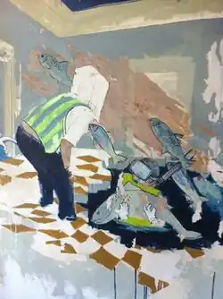 Dauphin created figurative art works, using mixed techniques and big formats. His paintings frequently reveal scenes of life illustrated with slogans and/or iconography. His subjects are inspired by his experience, current events and more generally his entourage. Following daily conversations, the artist projects the viewer's attention toward captivating characters, sometimes living on the brink of society. By matching these characters with improbable attributes, their apparent realism gives way to the imagination. During his periples, Dauphin worked with a deliberate challenge: to use a local palette of available materials. The combination of colors and material highlights the playfulness of his characters and emphasizes the dynamism of his subjects.
