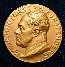 A close friend and adviser of Emperor Wilhelm II of Germany,[2] Max of Fürstenberg inherited territorial titles in Prussia, Austria, Hungary, Württemberg and Baden, and by virtue of them had a seat in the House of Lords in each of the five states.[3] Until the First World War, he was vice-president of the Prussian House of Lords.[4]