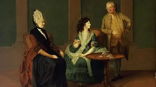 In 1773, acting on behalf of Sophie von La Roche, Dean Dumeiz arranged a potential marriage for Maximiliane.[10] The groom was the merchant Peter Anton Brentano, born 1735 in Tremezzo, who had moved to Frankfurt in 1751.[26][27] Peter Brentano was widowed after the 1770 death of his first wife Maria Josepha Walpurga Brentano-Gnosso (known as Paula) and already had five children.[28][10] He did not speak German well.[29] Agreement on the marriage was reached before 20 December and the engagement was made public on 26 December 1773.[30] The couple were married on 9 January 1774 in the chapel of Schloss Philippsburg at Ehrenbreitstein.[23][31] They lived in Nürnberger Hof in Frankfurt until 1778, when they moved to the Haus zum Goldenen Kopf in the Große Sandgasse road, which was located in central Frankfurt, close to the Goethe family residence and the cathedral.[32][28] A portrait painting of her between her parents, Georg Michael Frank von La Roche with Wife and Daughter by Anton Wilhelm Tischbein was a copy probably made for her on the occasion of her wedding.[33]