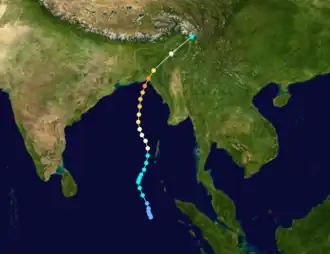 On May 17, the cyclone attained winds of 120 km/h (75 mph), equivalent to a Category 1 hurricane on the Saffir–Simpson hurricane scale. By May 18 an eye developed and the storm reached its peak intensity with winds of 215 km/h (135 mph).[1] At this time, the IMD assessed BOB 01 to have winds of 165 km/h (105 mph 3-minute sustained) and a barometric pressure of 964 mbar (hPa; 28.47 inHg).[2] The cyclone made landfall the following day near Chittagong, Bangladesh at this intensity.[1][2] After landfall, the storm rapidly tracked northeastward inland and dissipated early on May 20.[1]