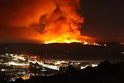 The Cocos Fire, previously known as the Twin Oaks Fire,[44] was a wildfire that ignited on May 14 in San Marcos, in the hills south of California State University, San Marcos.[8] The Cocos Fire quickly spread into western Escondido. The fire destroyed more than 40 buildings, including a dozen single-family homes.[45] Property damage from the fire is estimated at more than $5.7 million. Three minor injuries were reported.[46] The Cocos Fire was finally extinguished on May 22, 2014.[9]