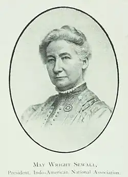 May Wright Sewall (née Mary Eliza Wright; May 27, 1844 – July 22, 1920) was an American reformer, who was known for her service to the causes of education, women's rights, and world peace. She was born in Greenfield, Milwaukee County, Wisconsin. Sewall served as chairman of the National Woman Suffrage Association's executive committee from 1882 to 1890, and was the organization's first recording secretary. She also served as president of the National Council of Women of the United States from 1897 to 1899, and president of the International Council of Women from 1899 to 1904. In addition, she helped organize the General Federation of Women's Clubs, and served as its first vice-president. Sewall was also an organizer of the World's Congress of Representative Women, which was held in conjunction with the World's Columbian Exposition in Chicago in 1893. U.S. President William McKinley appointed her as a U.S. representative of women to the Exposition Universelle (1900) in Paris.