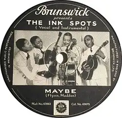 The first version to chart was recorded on June 11, 1940, by the Ink Spots featuring Bill Kenny and released by Decca Records as catalog number 3258,[1] with the A-side "Whispering Grass".[2] The recording reached number 2 on the chart that year.