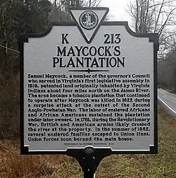 Samuel Maycock, born a gentleman, was a scholar of the University of Cambridge in England. In the Colony of Virginia, he sat on the Virginia Governor's Council.[1][3] Maycock patented 1,700 acres for his plantation in 1618. He was working on the land on March 22, 1622, with Edward Lister[1][2][a] and another man when they were massacred by Weyanoke people during the Indian massacre of 1622.[1]