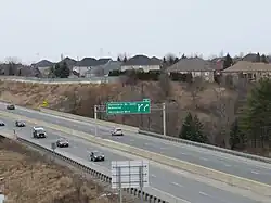 Highway 410 runs east-west through the neighbourhood, diverting from its predominantly north-south course as it swings westerly to connect with Highway 10, where it transitions into and turns north as the beginning of the latter highway. Hurontario Street runs southward from near the transition point and defaults via an overpass into Valleywood Boulevard northeastwards, with ramps connecting Hurontario with Highway 10, along which it officially continues.