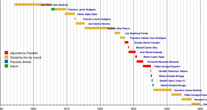 Some mayors are particularly notable, for example: Conservative José María Caro Martínez (1830–1916), father of José María Caro Rodríguez, the first Chilean Cardinal of the Roman Catholic Church;[4][5] Radical Carlos Rojas Pavez, the founder of Pichilemu, a newspaper which counted with collaborations of local journalist and historian José Arraño Acevedo and municipal worker Miguel Larravide Blanco;[6] and Christian Democrat Jorge Vargas González (b. 1967), a politician who was forced out of office in two different times, under charges of bribery.[7]