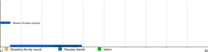 22. ^ Following Cabrera Martínez's resignation as mayor to be legally able to be a candidate for the office, he appointed Luis Calderón Gómez as the interim mayor, on 29 September 2008.[56] Since Cabrera was prohibited from using public offices in October of that year, Calderón held the mayoralty until 12 November 2008, when the city council elected Hernán Garrido Salas to complete Cabrera's term, which would last until 6 December.[57]
