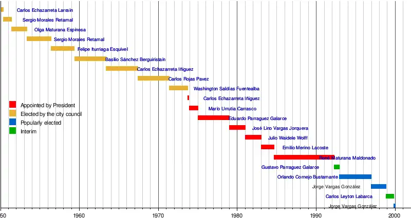 14. ^ Maturana Maldonado was the last mayor to be appointed by the Pinochet military regime, which remained in power until 1990. His appointment took place on 31 August 1984.[38] In 1989, the Region of O'Higgins Development Council decided that Maturana would stay in office for "good service" reasons, and began a second term on 16 October 1989.[39] Maturana Maldonado resigned in April 1992, and Gustavo Parraguez Galarce, municipal secretary was named acting mayor of Pichilemu. The first municipal election since the return to democracy were held that year.