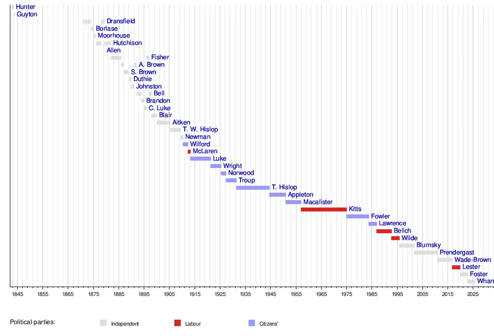 Tory WhanauAndy FosterJustin Lester (politician)Celia Wade-BrownKerry PrendergastMark BlumskyFran WildeJim BelichIan Lawrence (mayor)Michael FowlerFrank KittsRobert MacalisterWill AppletonThomas Hislop (mayor)George Troup (architect)Charles NorwoodRobert Wright (New Zealand politician)John Luke (New Zealand politician)David McLaren (politician)Thomas WilfordAlfred Newman (politician)Thomas William HislopJohn Aitken (politician)John Rutherford BlairCharles Luke (politician)Alfred Brandon (mayor)Francis Bell (New Zealand politician)Charles Johnston (New Zealand politician)John Duthie (politician)Samuel BrownArthur Winton BrownGeorge Fisher (New Zealand politician)George Allen (New Zealand politician)William HutchisonWilliam Sefton MoorhouseCharles BorlaseJoseph DransfieldWilliam GuytonGeorge Hunter (mayor)