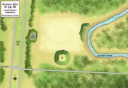 The site is located on the west bank of Second Creek, a tributary of the Homochitto River and consisted of three platform mounds and a central plaza. It was occupied during both the Coles Creek period (700–1000 CE) and the later Plaquemine Mississippian period (1000–1680 CE), when it was recorded in historic times as the White Apple village of the Natchez. Mound A sits directly on the bank of Second Creek and more than half of its mass has been lost due to the creek eroding into it. It is currently 8 metres (26 ft) in height but was recorded as being 6.1 metres (20 ft) in height and 45.7 metres (150 ft) in circumference by Montroville W. Dickeson in 1841 and 5.5 metres (18 ft) in height and 40 metres (131 ft) in length on the top by Calvin Brown in 1916. Mound B is located to the southeast and is 4 metres (13 ft) in height and has a historic cemetery on its summit. It still retains its flat topped shape. Dickeson was the only one to mention the third mound, which he described as smaller than the others and being further reduced by cultivation of its surface. By the time of the other surveys and investigations it is no longer mentioned and its location is still under investigation.[2] The site is named for a local African-American family from southern Adams County who once owned the land.[3]