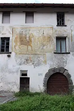The 15th-century painting on a house in Vicolo della Torre, which depicts scenes of battles with camels and elephants, tropical plants and oriental figures, attests to the connection of Mazzo with the Republic of Venice, whose merchants crossed the Mortirolo Pass to reach the Raetia.[8]