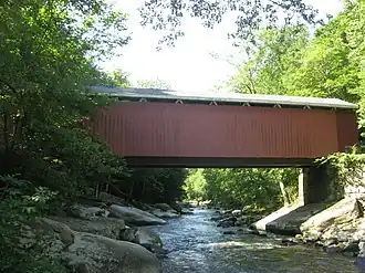 The McConnell's Mill Covered Bridge is an historic, wooden covered bridge that is located in Slippery Rock Township, Lawrence County, Pennsylvania, United States.[2]: 2  It spans the Slippery Rock Creek in McConnells Mill State Park,[3] southeast of Rose Point.[2]: 5
