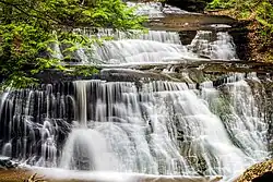 Slippery Rock Gorge Trail is a difficult trail that is part of the North Country Trail and is marked with blue blazes. The trail passes through several different geological areas. The first portion of the trail is in the upper end of Hell Run gorge. The trail then descends into Slippery Rock Gorge and onto an alluvialflood plain at the bottom of the gorge. From the flood plain, the trail ascends the gorge and descends once again before following the main creek bank to its terminus at Eckert Bridge.[3]