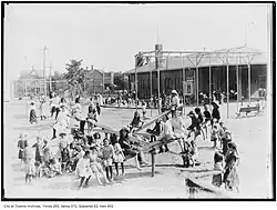 It was the third supervised children's playground on municipal property that was managed by the Toronto Playgrounds Association,[53] after St. Andrew's Playground on Adelaide Street in 1909[34][53][54][55] and Osler Playground on Argyle Street in 1910.[56][57][58] Emulating the playgrounds of the Chicago South Park Commission,[27][28] it was the association's first playground to have an indoor recreation centre that operated all-year.[59] It was the largest permanent playground in Toronto[60] and its area grew in 1957 when Toronto City Council acquired an additional 0.41 hectares (1.0 acre) of adjacent land for $125,000[61] ($1.33 million in 2023 dollars).[29]
