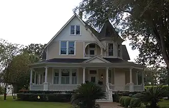 Built in c.1907, the structure is a two-story frame residence in Queen Anne Revival style with Colonial Revival gallery columns. The building features an octagonal turret with faceted roof, an horseshoe arched balcony and an Ionic gallery which turns 45 degrees at the corners.[2]