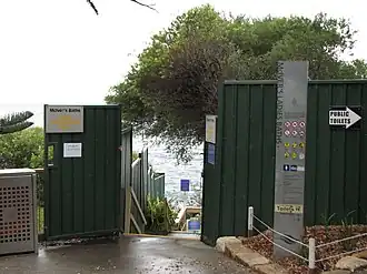 Accessed from Grants Reserve, the privacy of the baths (and sitting/sun-bathing areas) is maintained by dense landscaping, winding concrete pathways and stairs that lead directly to the water.[1]