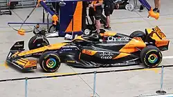 The car featured a special livery for the Monaco Grand Prix (see § Liveries).[32] McLaren fitted circuit-specific beam and rear wings to suit the high downforce requirements of the Circuit de Monaco.[80] Piastri and Norris qualified second and fourth respectively,[81] and they finished in the same positions.[82] Norris moved up to third in the WDC.