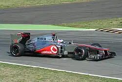 The McLaren MP4-27 is a Formula One racing car designed by Vodafone McLaren Mercedes for the 2012 Formula One season.[6] The chassis was designed by Paddy Lowe, Neil Oatley, Tim Goss, Andrew Bailey and John Iley and was powered by a customer Mercedes-Benz engine. The car was driven by former World Champions Jenson Button and Lewis Hamilton. It was launched on 1 February at the McLaren team base in Woking, Surrey, ahead of the first winter test sessions at Jerez de la Frontera.[1][7] This was the last McLaren car that Lewis Hamilton drove for the team, as he moved to the Mercedes AMG Petronas F1 Team in 2013. This was also the last McLaren Formula One car to win a race until the McLaren MCL35M did so in 2021 and the last to win more than one Grand Prix in a season until the MCL38 of 2024.