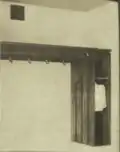 Mahogany furniture of colonial design is used in the supervisors' rooms while the student nurses have low artistic metal beds, enameled in brown or cream, and walnut furniture. Every room has a buzzer in the built-in wardrobe closet which is manipulated from the telephone desk. The occupant is expected to go to the telephone which is found on every landing, when called. All student nurses' rooms have a plate rail around the room, in place of a picture moulding. A device for holding towels and wash cloth, designed by McLaughlin, as part of the wardrobe closets is included in bedrooms. All bedroom doors have transoms except on the sixth floor.[5]