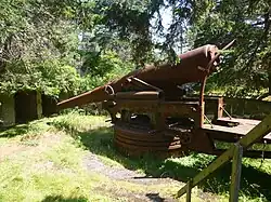 During World War II, a battery of two 10 inch M1888 guns were built on the island. It was abandoned in 1945 after the war ended, but the guns remain in place until today.[3] However, the island wasn't abandoned in 1945 because there were a few families who lived there during and after the war.