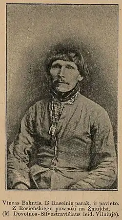 Davainis-Silvestraitis collected folklore based on the methodology that he learned from Jan Aleksander Karłowicz: he recorded who, when, and where told him the text, attempted to record the texts as accurately as possible, and provided some comments in footnotes.[52] Most of the folk tales were recorded in 1887 (270 tales) and 1889 (169 tales). He recorded the tales from 247 people in 82 different villages and towns around Raseiniai. Additional 30 people told their tales in other locations in Lithuania.[47] In addition to folk tales, Davainis-Silvestraitis collected about 250 folk songs, 500 short folklore sayings, 600 spells, 1,000 descriptions of folk medicine and medicinal herbs.[48] Vincentas Bakutis (1829–1899) was the biggest local collaborator and supporter of Davainis-Silvestraitis. Bakutis was a local man who lived in poverty but was highly respected for his wisdom and knowledge. Likely, he was the main source of various traditions, games, spells, medicinal herbs, etc. collected by Davainis-Silvestraitis.[53] Bakutis continued to collect and write down folklore even after Davainis-Silvestraitis left Lithuania.[54]