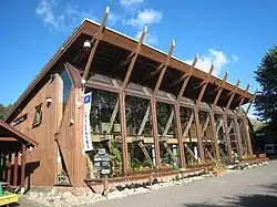 The main building provides administrative rooms for the farm, and meeting rooms for local groups. It is an example of Walter Segal system of self-build construction which is environmentally-friendly in its use of materials and energy. It is a low-energy building using the principle of solar gain; it has a turf roof and uses a reed bed drainage treatment system. It was officially opened by the Environment Secretary, Michael Meacher and was also visited by Prince Charles in 2002.[7]