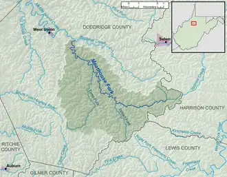 The Meathouse Fork is a tributary of Middle Island Creek, 19.7 miles (31.7 km) long,[5] in north-central West Virginia in the United States. Via Middle Island Creek and the Ohio River, it is part of the watershed of the Mississippi River, draining an area of 64.6 square miles (167 km2)[6] in a rural region on the unglaciated portion of the Allegheny Plateau.